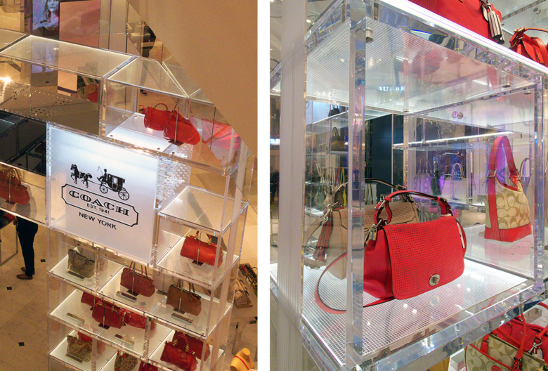 The second project is a kiosk for leather goods company Coach in the Macy's store at Herald Square. The department store is in the midst of a $500 million renovation of its full-block store, and one of its first tasks was to change its main entrance at 34th and Broadway, where a number of luxury designers (Burberry, Longchamp, Gucci) inserted mutli-floor boutiques into the perimeter. Coach is one of the brands relegated to the selling floor, but this did not discourage Mr. Shigematsu from pushing the envelope, if you will, to give them more exposure. Faced with Macy's own version of New York City's Zoning Code, OMA shaped the plan of the custom acrylic shelving (embedded with LED lighting) to build above the allowable height; Macy's allowed the two walls of storage in a compact V-formation to extend all the way to the ceiling. This reveals how OMA is never content to work within restrictions, but it is also just the beginning of a longterm relationship with Coach.