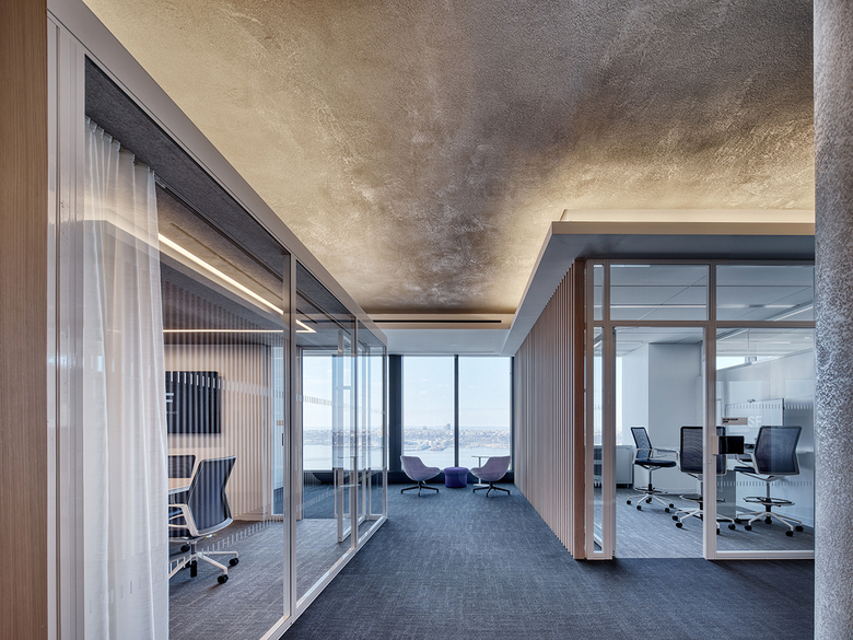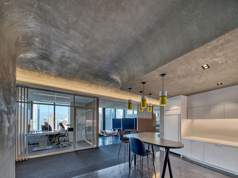 Adjacent to the stair are large conference rooms — their glass walls veiled by the beaded artwork (what feels like an homage to Philip Johnson's design of the Four Seasons restaurant in the Seagram Building) — as well as a large cafeteria whose ceiling is a continuation of the sculpture. These spaces are special, but it's the offices beyond them that make BSF far from a traditional law firm. Dark terrazzo walls and textured concrete walls that curve gracefully into the ceilings draw the gaze to the views through the all-glass exterior walls. The fact those views are actually possible arises from two design features: glass-wall partitions and a plan that moves principals in-board, away from the exterior walls. Lawyers, among many other professionals, normally covet the window office or corner office, but BSF's emphasis on collaboration led to an atypical layout more akin to an architecture firm or another creative discipline rather than law. Furthermore, corridors are angled or make the occasional zig-zag to cut down on long, repetitive vistas; combined with co-working spaces, kitchenettes and other amenity spaces, the layout defines memorable areas within the large office. Yet aiding in wayfinding are touchscreens near the elevators, which are also used to book conference rooms for meetings and the like. This technological feature gets at one of the most unique aspects of Schiller Projects.