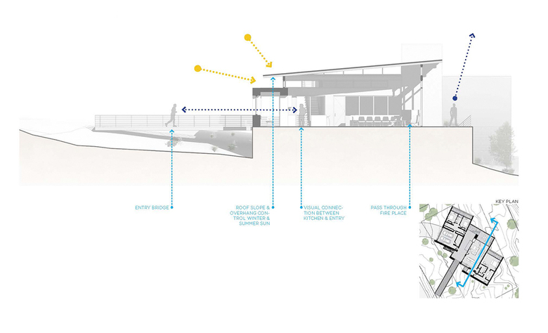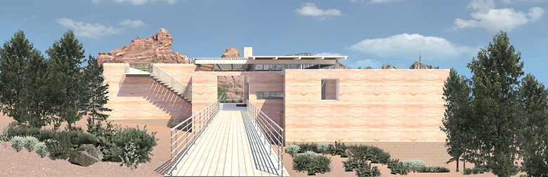 Located near Sedona, this project will be built on a half-acre property surrounded by mature vegetation and skyward views of the red Sedona cliffs. Through site analysis and sun studies, we focused on three main views that would be captured thorough different times of the day. We wanted to capitalize on these views to unite the home with the mountains beyond as we tracked the owner’s typical routines from morning through night. At the end of a 60’ bridge used to enter the hilly property the house is split to allow for a breezeway entry, which will promote airflow and passive cooling, as well as frame a direct view through the house and onto the Arizona landscape beyond.