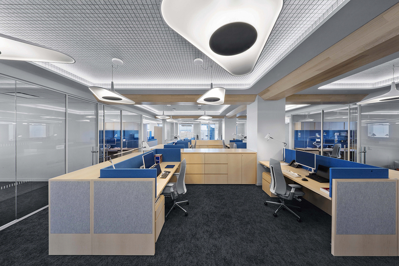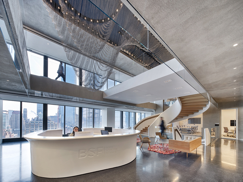 Above the main reception desk at BSF is an undulating artwork made with metal beads, one sure sign that something different is afoot in this office. With a large opening in the floor accommodating the suspended sculpture, as well as openings for the adjacent three-story staircase, it's also clear that the layout of the law firm's office in the tower required some foresight and coordination. Having announced their intention to move into 55 Hudson Yards a full three years before it happened, client and architect were able to coordinate with tower architect KPF and their engineers to frame the openings that would lead to the "Wow!" moment at reception. That drama is accentuated by the fact the steel guardrails of the curved stair are all individual pieces: fabricated off-site, the steel stair was cut into 4-foot sections that were craned into place and welded together before the curtain wall was installed. The gentle curve and incline of the stairs make for a gorgeous centerpiece alongside the beaded sculpture, though they also encourage the lawyers to stay active and walk up and down the stairs as they move about the 100,000-square-foot office.