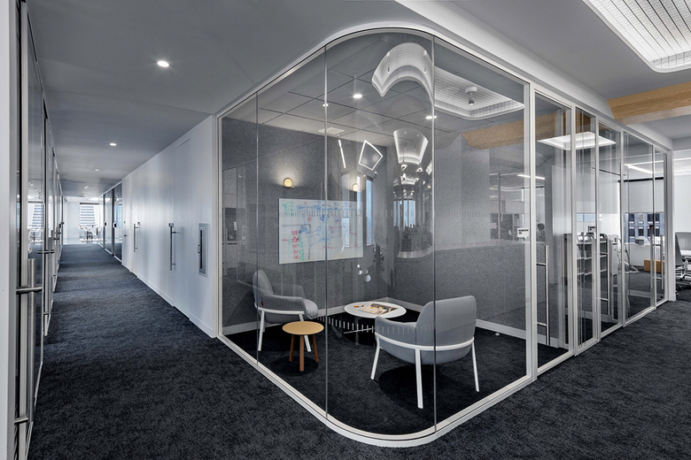 Small breakout spaces, metrically tailored to their exact meeting frequency and scale, are distributed evenly throughout the space. Legal support staff are present and available with equal access to office resources, the attorneys and the views.