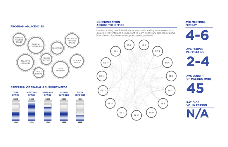 Next to the typical menu items (About, Projects, Press, Contact) on the website of Schiller Projects is something different: Workplace Strategy. How does Schiller's firm find the best fit for a particular company? In their words: "Our approach combines our team’s capacity for spatial and design thinking with data analytics and measurement." Put simply, they spend a lot of time doing data-heavy analysis before they even tackle design. A mix of research and data collection that consists of site observation, facilities review, employee surveys, workshops, interviews, and other things results in a custom report that expresses the client's current state of affairs and their future potential. The report informs the subsequent design idea but also extends to pieces like the touchscreens at BSF, which can be used to do post-occupancy evaluations and even point to areas for office reconfiguration.