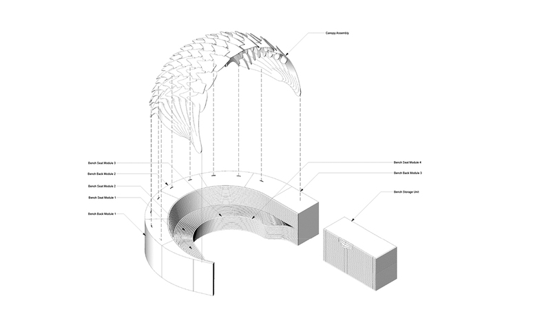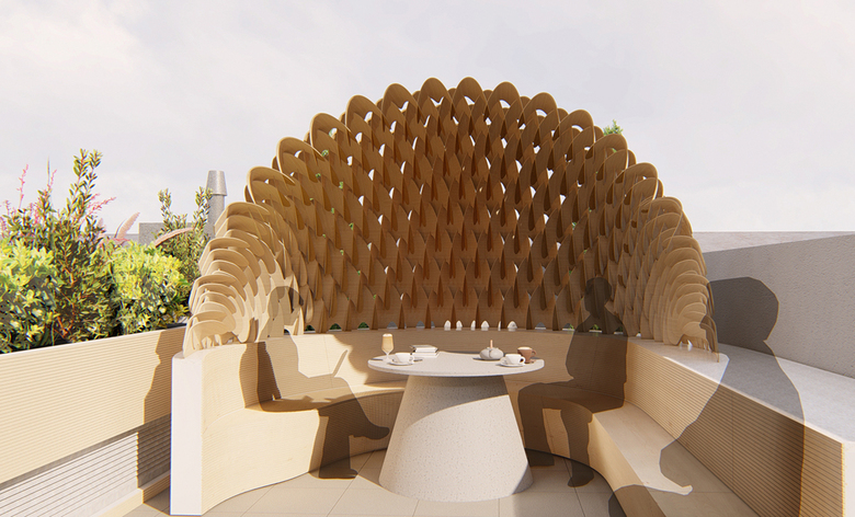 The London Pavilion studies the capacities for self-supporting wood structures that minimize environmentally more harmful (steel and concrete) connections or supports. The initial study for a tiled mass timber canopy has evolved into a detailed medium scale application for veneer lumber tiles that are all uniquely fabricated from a single standard sheet good, applied to a single mold to create curvature. This process results in an unlimited possibility for differentiation between the tiles with minimal waste. While each tile is unique the process to make, it is not and the process to install them requires simple labor repeated. The shape of the tiles and the shell responds directly to light wind and rain patterns on our site to optimize for comfort and use year-round. The panelized shell will be constructed from locally source materials that are able to withstand London’s damp climate.