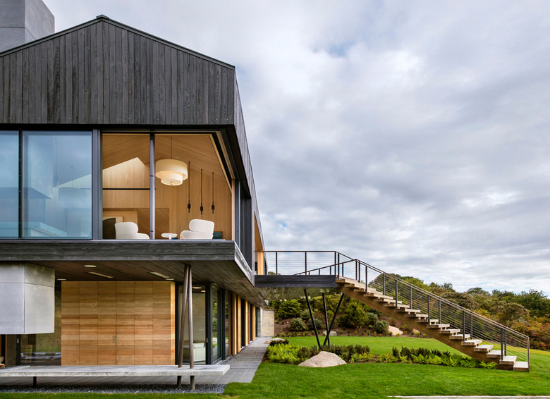 The simple, dark building are approached via a farm road that we designed to meander along the edges of the property through Chilmark’s dense thicket of scrub oak. A broad stair links a large south-facing porch back to the farm road and provided pedestrian access through the field to the beaches beyond.