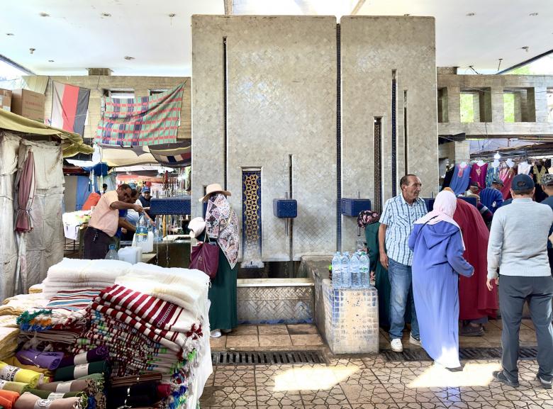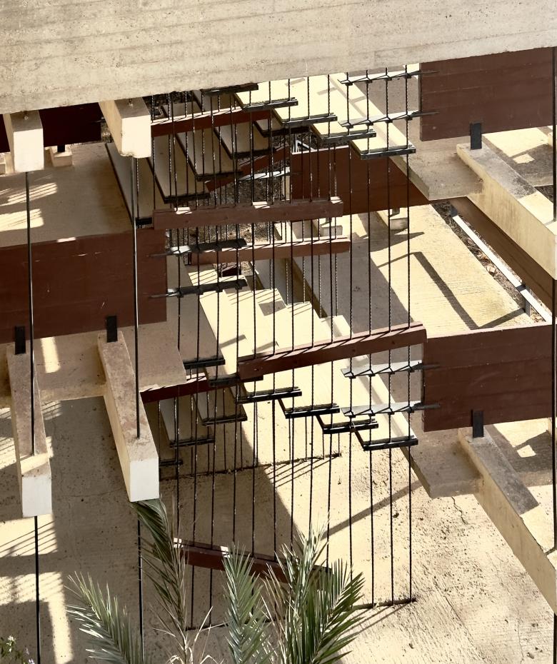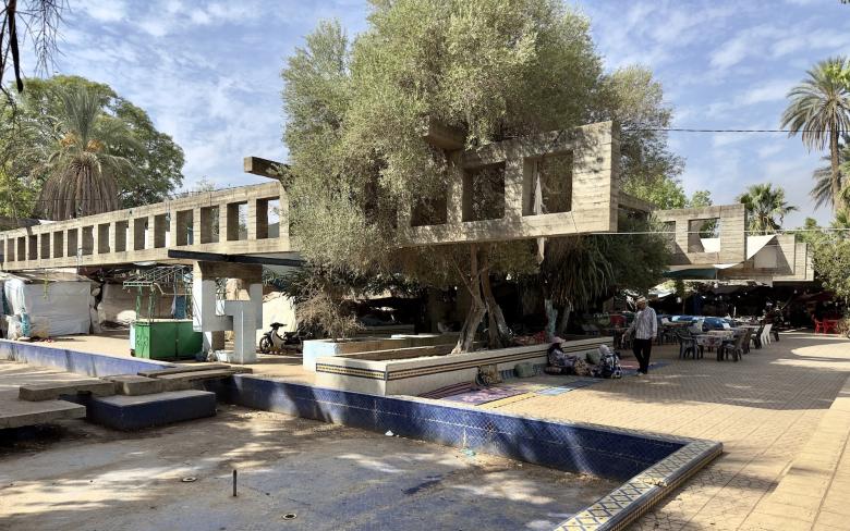 A “great canopy” covers the main public square, which is accessed via a staircase and serves as a distribution point. From there visitors could originally access the palm grove and swimming pool, the hotel, and a market. The public square covers 3,000 square meters and is spanned by a series of Vierendeel trusses. Beneath it are planters, seating areas, water basins, and a fountain, which drew people from far and wide to take water home with them. Today, the water basins next to the fountain are dry and an informal market has established itself under the great canopy, obscuring the sequence of spaces.
