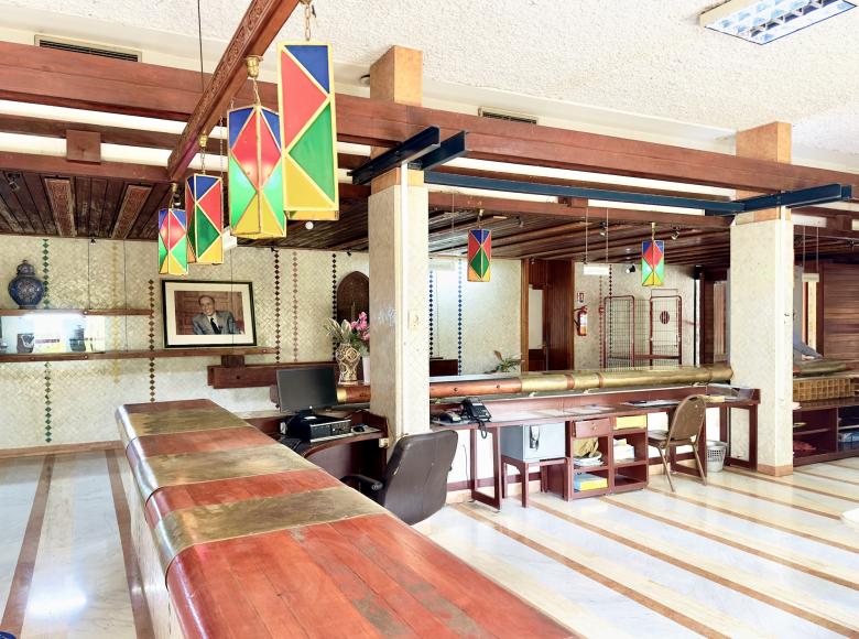 Although the hotel is still in operation today, the gardens and grounds are closed to visitors. The building stands on eight V-shaped supports that span an undercroft space with sculptural fountains. Over the years, the entire exterior of the hotel has been “beautified” through several inappropriate renovations. The original architectural references to materials, passive air conditioning, and abstract forms of traditional architecture have been obscured under a layer of decoration in an effort to adapt the complex to rather banal, popular taste.