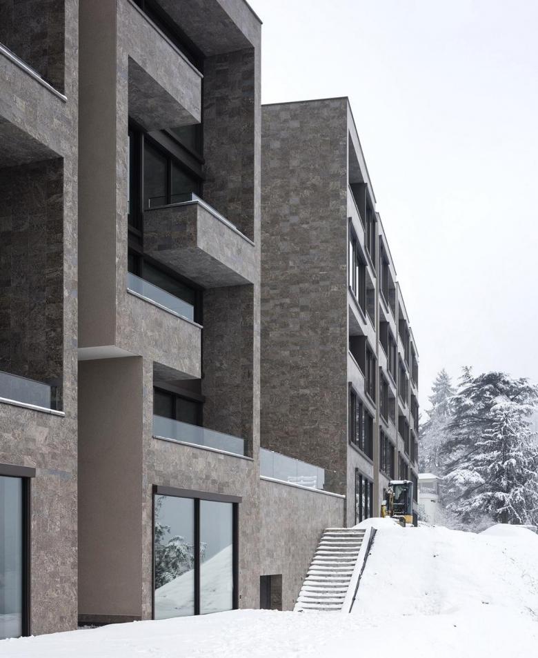 Stücheli Architekten's Lakeside Residence Villas at Bürgenstock Resort take advantage of their prime location along a ridge above Lake Lucerne by building vertically. A series of five-story buildings separated by narrow gaps follow the ridge and contain villas ranging in size from 538 to 814 square meters. The site plan (visible in a Praxis feature at German-Architects) ensures that the villas form a courtyard with the other resort buildings and have unobstructed views of the lake. The generously sized villas also have generous 3-meter-tall living spaces with floor-to-ceiling windows.