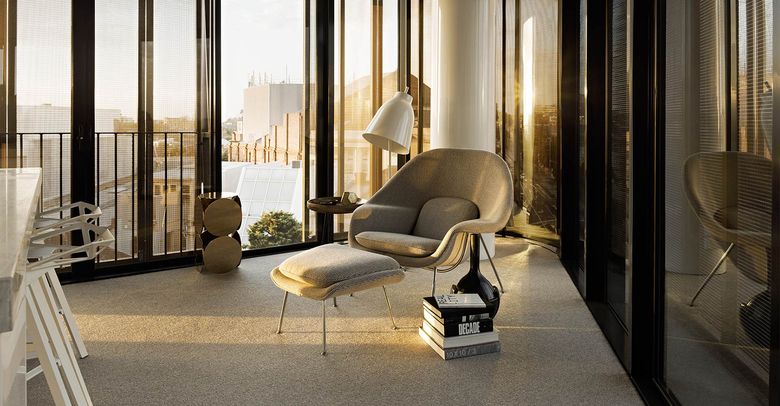 Further control comes with how the lighting integrates with the bronze mesh and the similarly colored glass. In the architect's words: "Switching the inside lights on reflects the interior of the apartment onto the windows, and people outside can see in; however leaving the outside lights on illuminates the interior, turning the windows transparent, and people outside are prevented from seeing in by the reflection of the lights on the glass."