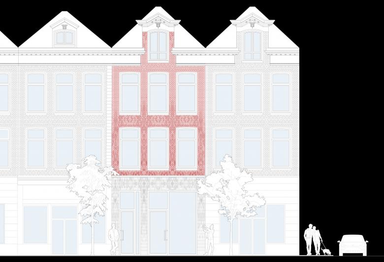 Studio RAP retained the silhouette and tripartite structure of the existing facade to maintain the basic character of the building and the way it fits in with its neighbors on PC Hooftstraat. Passersby might not even notice the building with just a quick glance, but a closer look reveals the atypical, undulating character of the masonry. The retail storefront and entrance to the upper floors are framed in white glazed 3D-printed tiles. The masonry facade on the upper floors is made from 3D-printed bricks glazed in three distinct shades of red. While the storefront tiles fade from smooth to complex as they rise vertically, the rippling texture of the bricks fades from complex on the first floor to flat on the second, as evidenced by the two photos below.