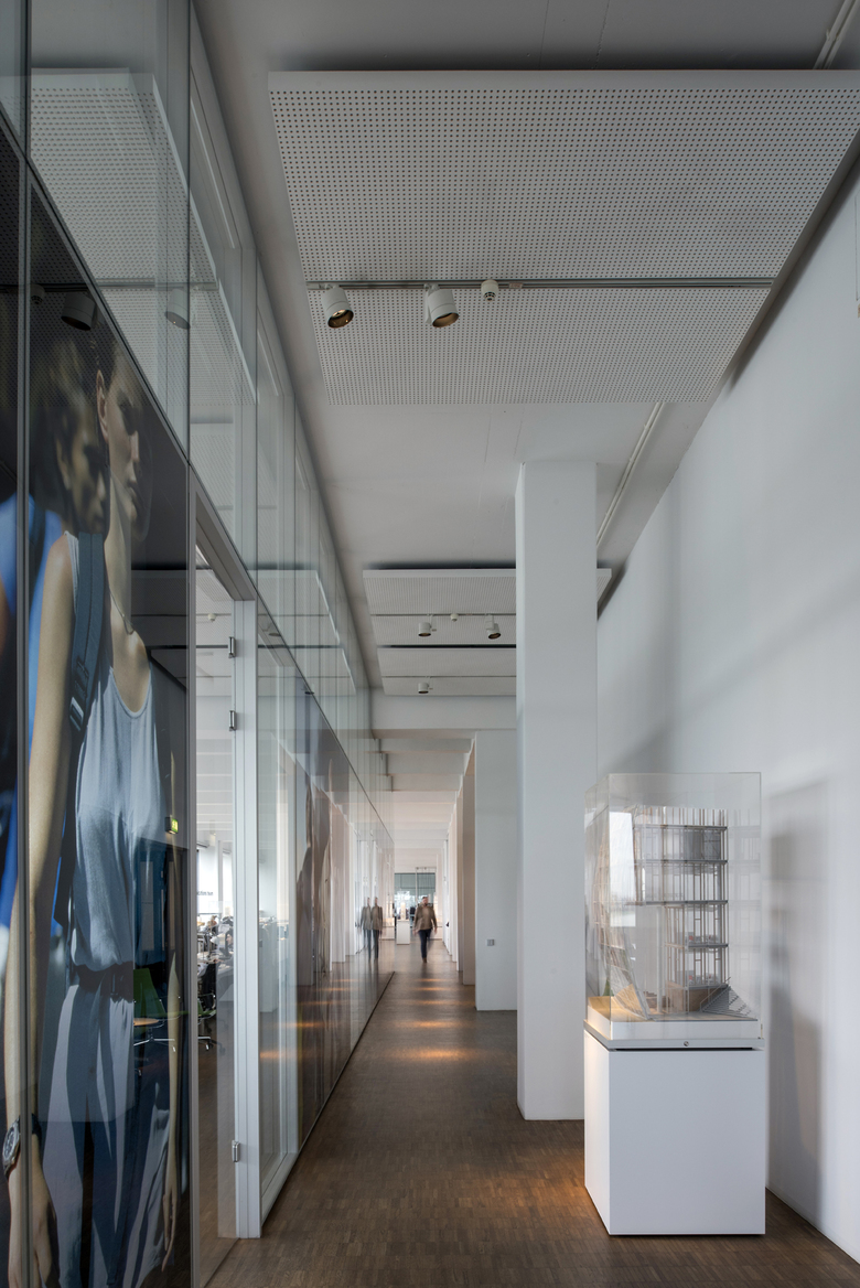 The Plange Mill in the Düsseldorf Media Harbour, built at the beginning of the 20th century, was once used for the production of flour. Now the carefully renovated complex forms an exciting symbiosis of old and new in which creative minds forge unique ideas. The successful integration of the original buildings is particularly impressive, such as the historical clock tower embedded in the modern linear building construction. On the fifth floor of the new building, above the urban hustle and bustle, are the generously proportioned offices of ingenhoven architects. High, loft-like ceilings, white walls and a communicative island of desks positioned along the entire length of the room form an open working environment for around 100 architects – along with a fantastic view of the Rhine and Düsseldorf's skyline.