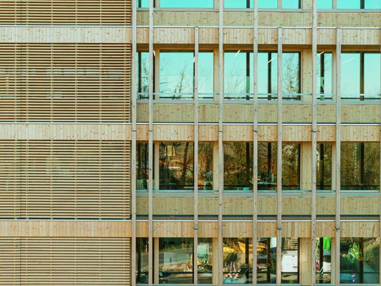 Johanna Deinet: We had the privilege of developing a project for Blumer Lehmann AG, a timber construction company that is very eco-minded and is more than willing to push the boundaries, too. For their new head-office building in Erlenhof near Gossau (St.Gallen), they were keen to utilize every possible benefit of modern wood construction. So, drawing inspiration from Andy’s Center for Agriculture, we also designed our new building’s facade with wraparound balconies to give shade, and incorporated a night cooling system featuring automated ventilation flaps. Additional cooling is provided by activated piles that extract cold from the ground and feed it into the various offices.