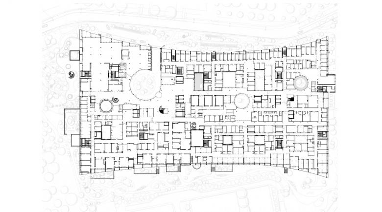 The patient rooms line the building on the top floor. The floor plan also shows the four round courtyards along the patient pathways and twelve additional rectangular atriums, which supply all the offices with daylight. (Plan: © Herzog & de Meuron)