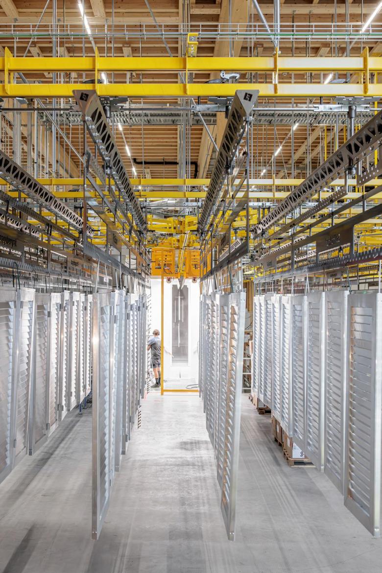 Its pleasant indoor environment and its impressive eco-credentials aren’t just attributable to the new hall’s construction materials. They’re also (and above all) the product of its sophisticated building technology. Existing resources are particularly well used. A 4 000-square-meter solar energy facility which is mounted on the building’s roof and eastern facade provides electricity for the machinery and the powder coating plant. This facility can generate up to 700 kWp – enough to cover 80 to 100 per cent of the building’s annual energy needs and supply several local electric car charging stations, too. If the site’s energy generation exceeds its energy needs, the surplus electricity is fed into the public grid. And should the operation be occasionally unable to meet its own energy needs, Griesser will buy-in only green energy to cover the temporary shortfall.