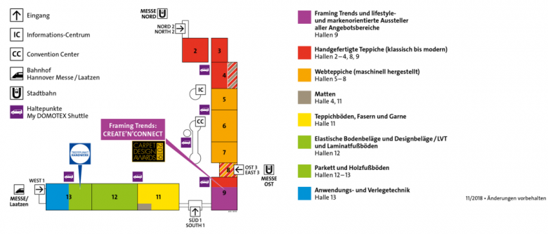 Hall plan of the Domotex trade fair with the special area "Framing Trends" in Hall 9. (photo: Deutsche Messe)