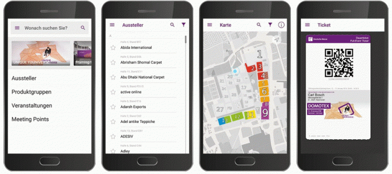 Useful when planning your visit to the trade fair: the Domotex app helps you organize exhibitors, product groups, events, and meeting points. (photo: Deutsche Messe)