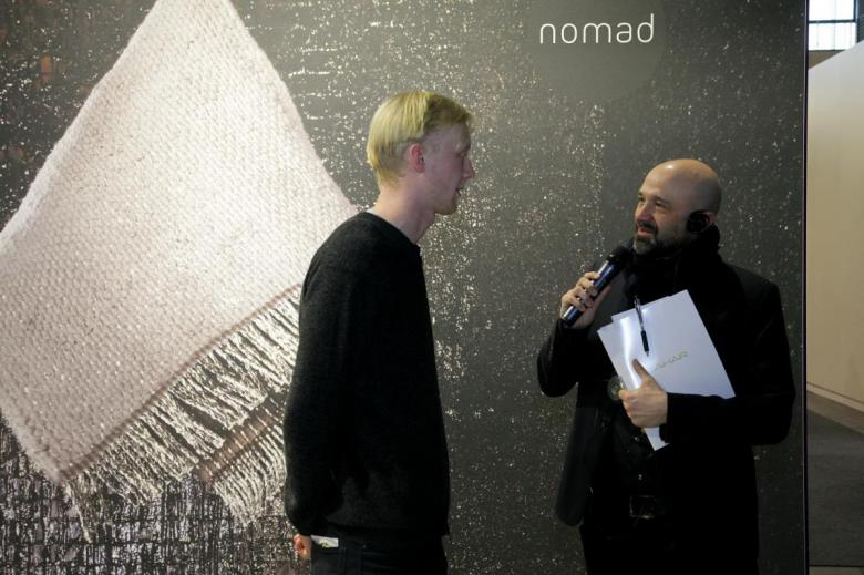 An exciting contribution to the Framing Trends 2018 was the carpet made of candy wrappers at the nomad stand, here with the internationally renowned architect Jürgen Mayer H. (right). (photo: Mathias Duerr / World-Architects)