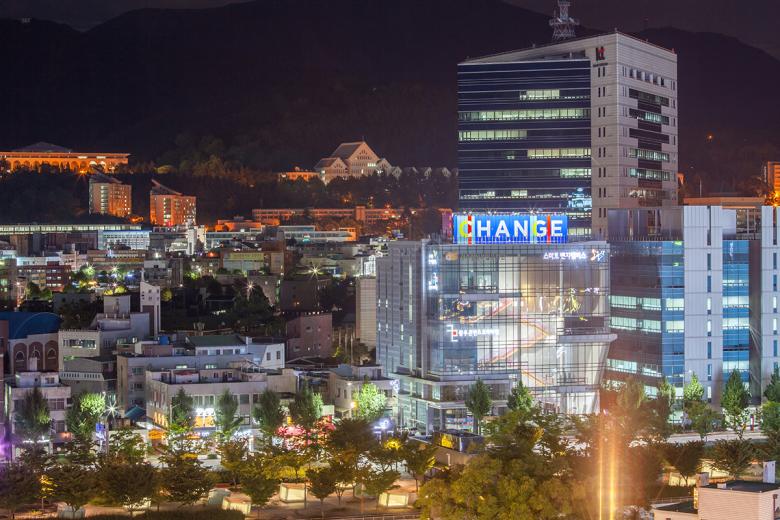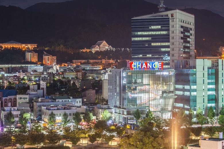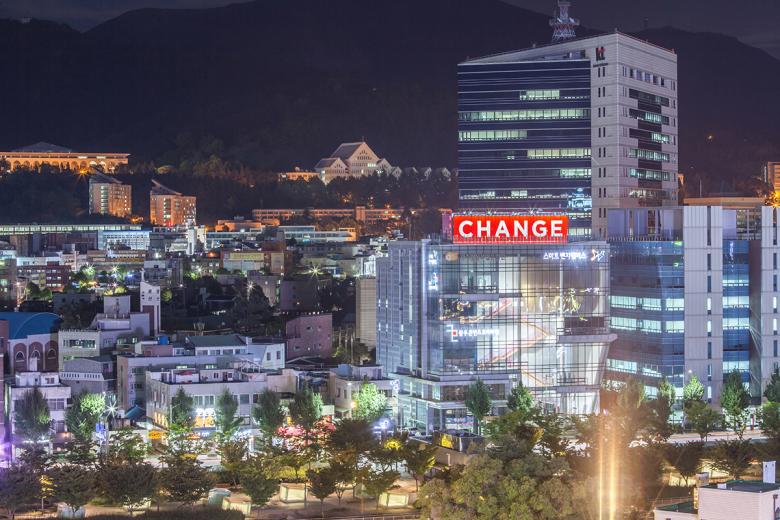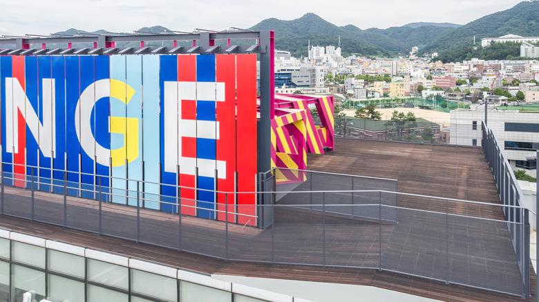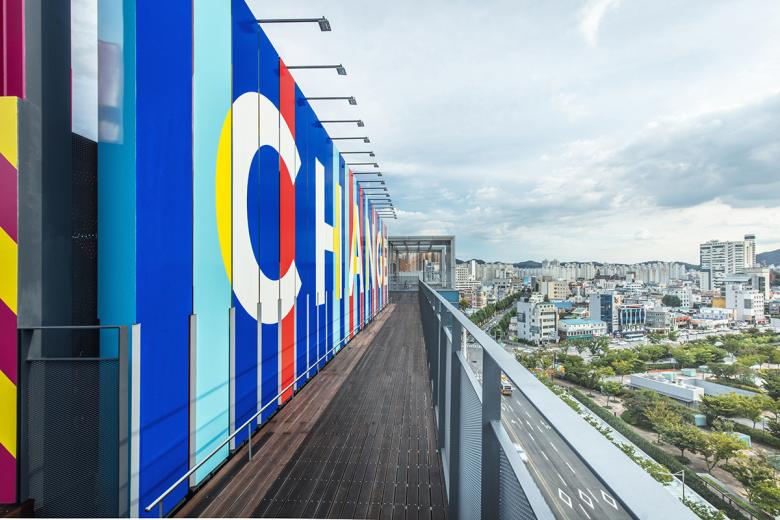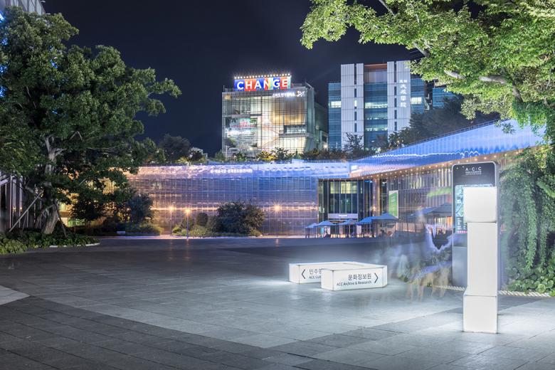 Visible from a great distance, the installation Architecture of Autonomy is located on the roof of the Cinema Culture Complex, a public high-rise directly opposite the important Asian Cultural Centre. The building is in the immediate proximity of the May 18 Democracy Square, a central site of the democratic citizens’ movement of the 1980s in Gwangju, South Korea.