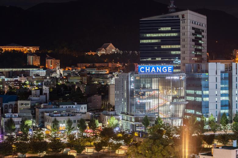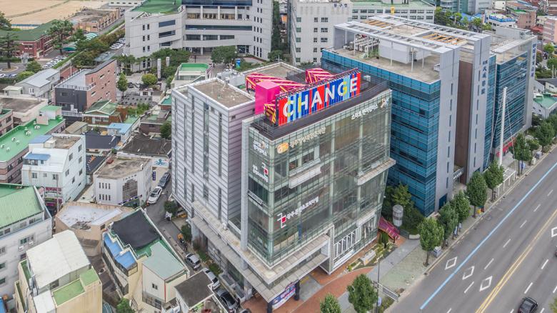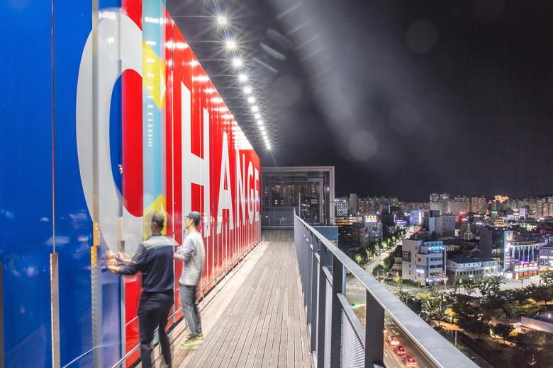 Architecture of Autonomy is a permanent installation in public space commissioned by the Gwangju Biennale. It was created in collaboration with the Korean architect Moon Hoon. With its large-format appeal "CHANGE," the theme of the work is the city as a field of tension between manipulation and participation, between the pressure to conform and individual development.
