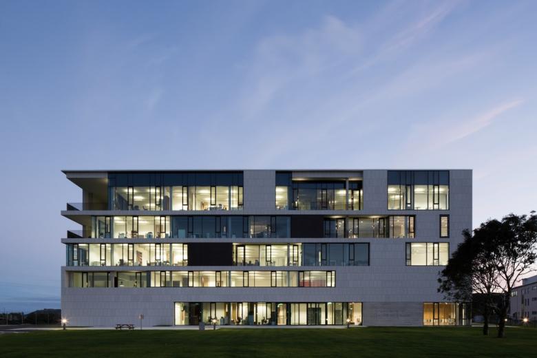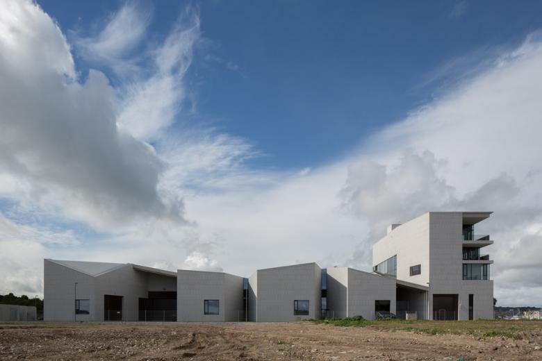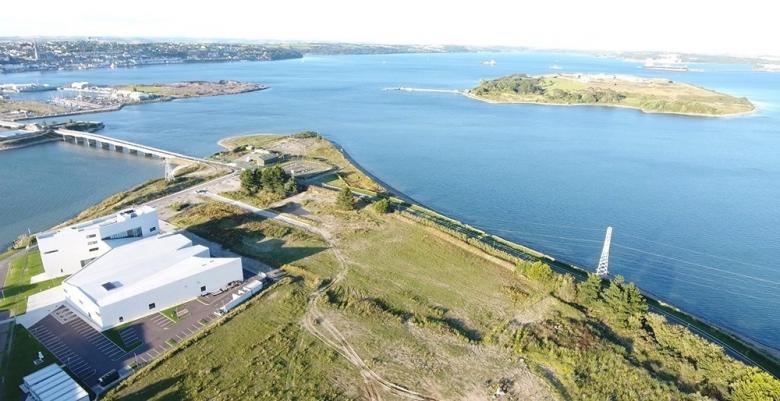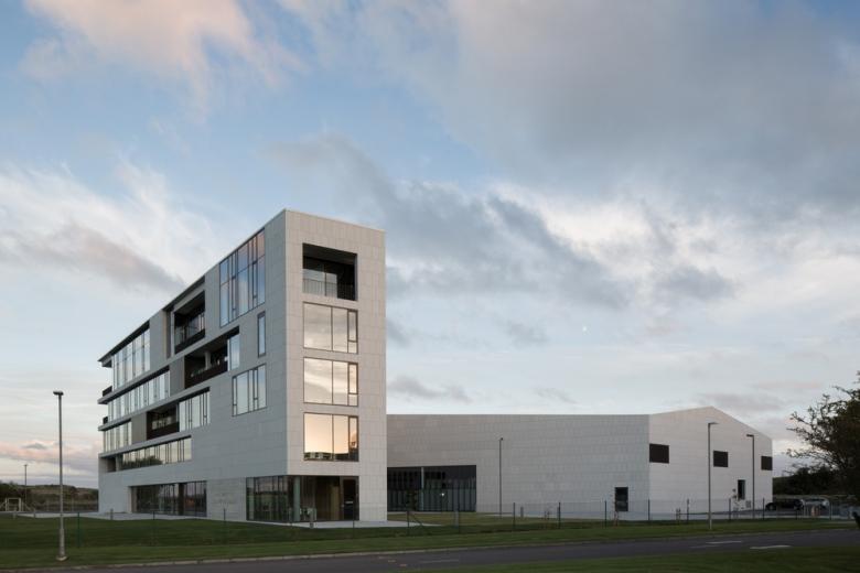 The project, a Maritime Energy Research and National Ocean Testing Facility located beside the Lower Harbour in Cork, Ireland, involves a tall element housing research spaces and a lower tank hall containing testing facilities.