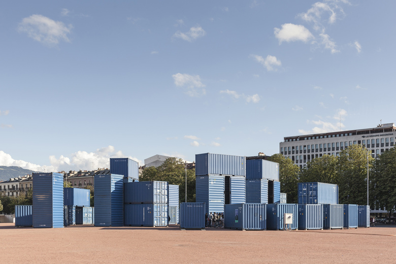 BIG is the new biennale for independent art spaces in Geneva. For its first edition BUREAU A was commissioned to design an open air venue for the event. Built with 50 shipping container, the settlement is based on the archeological plan of the Neolithic monument of Stonehenge, creating a large circular common space.