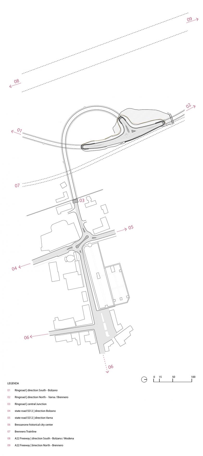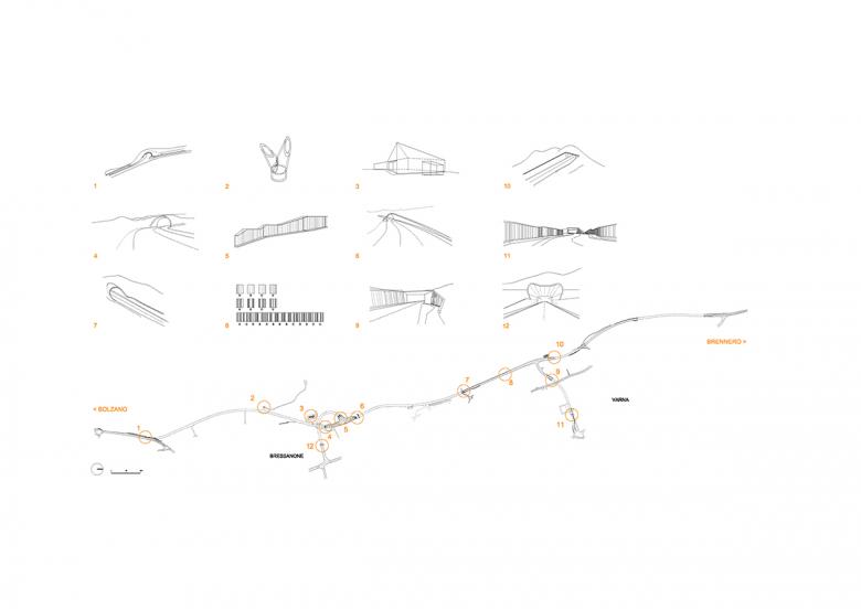 The design brief called for a series of interventions (tunnel portals, retaining walls, acoustic barriers, service substations, mechanical structures, ventilation chimneys, and various signage elements) along its entire length, and is guided by three simple design decisions. Firstly, the architects sought to minimize the environmental impact of the elements above ground in order to express both an architectural and technical quality. Secondly, these elements and those below ground were conceptualized into a unified, consequential design approach, and were calibrated to accommodate the particularities of the immediate site conditions. Lastly, the Bressanone and Varna tracts were pulled together into one continuum whereby the two townships are no longer conceived as distinct contexts but as two parts of a greater whole.