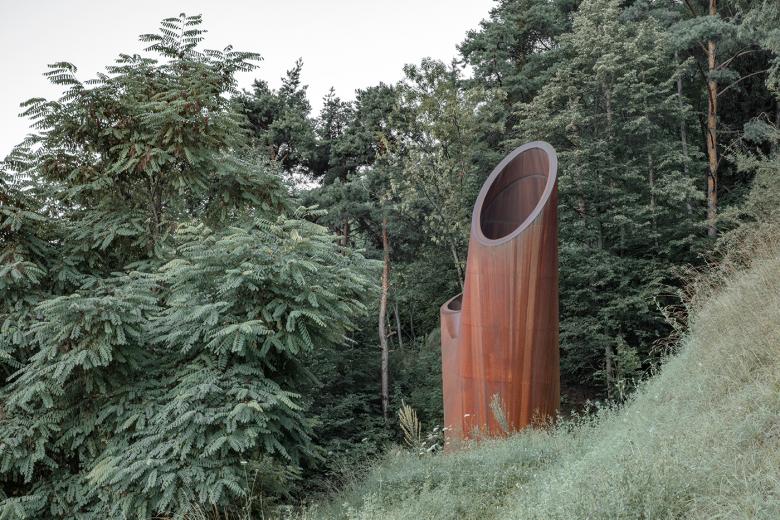Materials: exposed concrete, Leca-beton (structural light concrete with Leca expanded clay aggregates), Cor-ten steel, larch wood