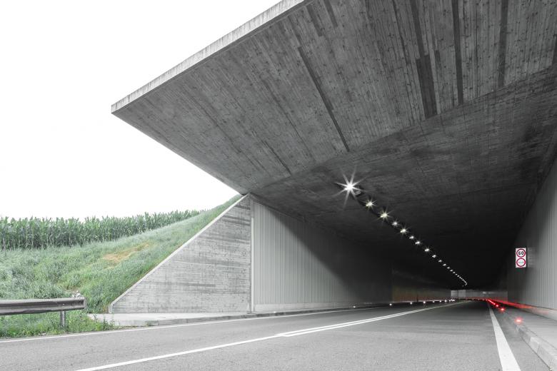 The concrete work of the new addition is made of aggregates and excavation materials drawn from the ongoing construction site of the 64km Brenner Base Tunnel traversing below the Alps from Innsbruck, Austria, to Fortezza, Italy. Together with exposed concrete, larch wooden acoustic barrier walls and Cor-ten steel ventilation chimneys, the portals constitute important sites of architectural design: they lie at the intersection of landscape, infrastructure and mobility. These interventions mark the threshold between below ground and above ground,  becoming part of the urban landscape of Bressanone, and also defining the fleeting, motorist experience.