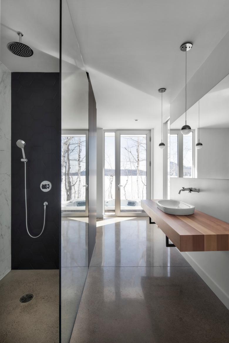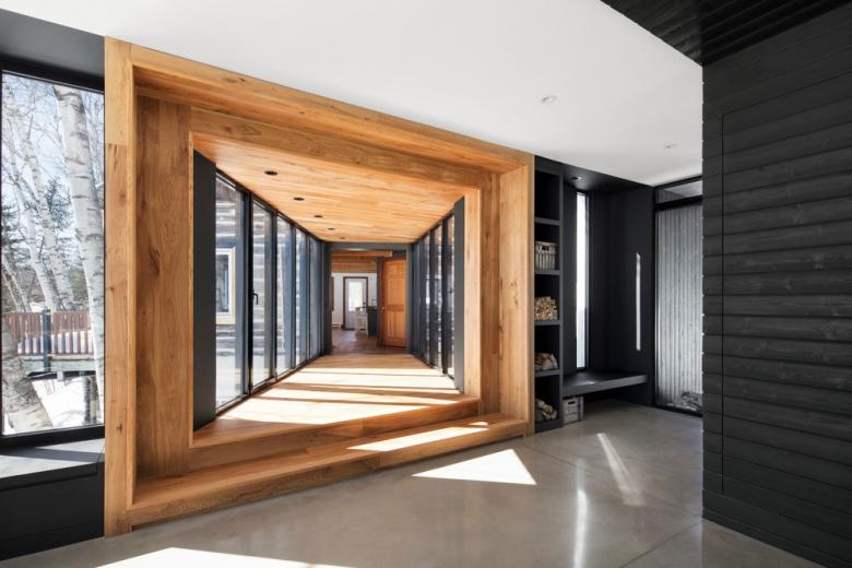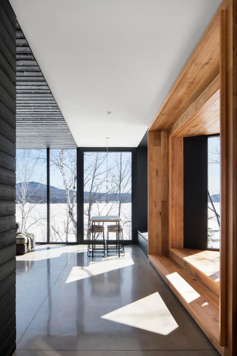 On the ground floor, an open-plan space and large windows allow spectacular views on the lake. Polished concrete floors and natural wood details are used with simplicity, emphasizing the materials’ richness. Surrounded by black slatted wood, the central fireplace creates a relaxing ambience and an oasis of comfort in the vast living room. Built-in benches offer private spaces in common areas and cleverly include hidden storage. The living room and its gaming table encourage the children to make the space their own, providing playful and relaxing family time.