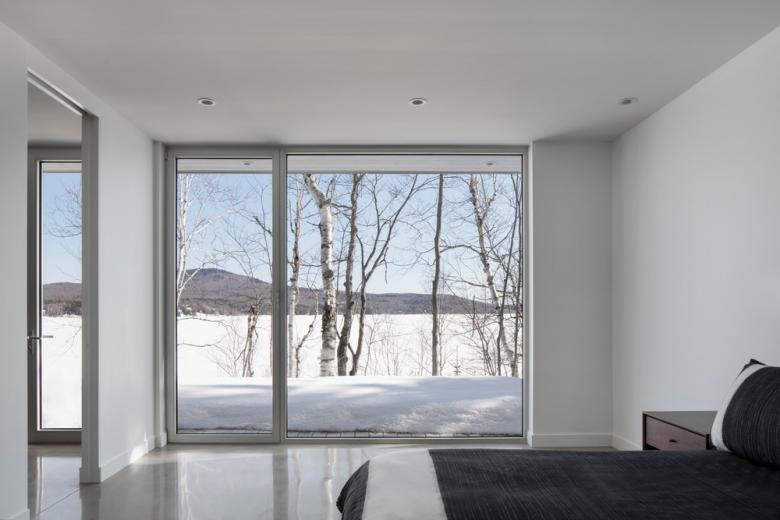 The architects designed the new master bedroom at the lower level. Nested in a cliff, the room benefits from the descending topography of the site and receives plenty of sunlight.