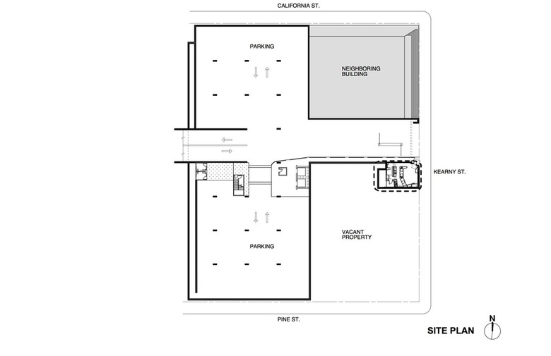 The cafe sits at the entrance to Saint Mary’s Garage, located centrally on the block of Kearny Street directly across from the Bank of America plaza. This stretch of sidewalk has been plagued by vacancy: adjacent lies a neglected lot, and the space itself has been empty for at least twenty years. After the Loma Prieta earthquake, the garage underwent seismic upgrades. This placed a large concrete shear wall between the space and the sidewalk, effectively making it undesirable for retail. In an effort to bring life back to this crucial pedestrian zone, the concrete shear wall was opened, connecting the space to the sidewalk. In order to reduce waste, materials were used sparingly. Instead of covering up an othewise rough shell, existing concrete and piping were refreshed and left exposed, celebrating their industrial character.