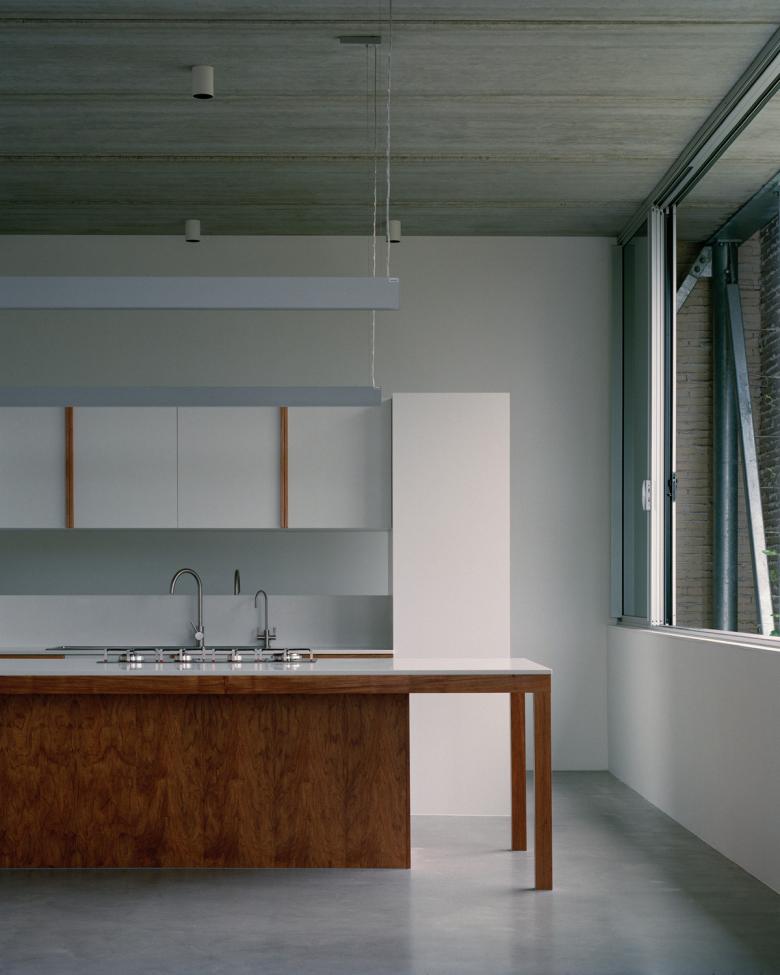 A similar concertina of brickwork stretches horizontally in the form of a set of large approach stairs, this time with their brick extrusion holes exposed for drainage. To the south, I cut large slots horizontally into the facade to create masonry “louvres”, giving both shading and privacy. The house has parapet walls and no overhangs, its flat internally draining concrete roof piled with stones. The roof has a “plug and play” nature where various paraphernalia such as antennas, satellite dishes, solar hot water tanks, photovoltaics, and so on can be added or taken away as technology changes, with no effect on the house whatsoever.