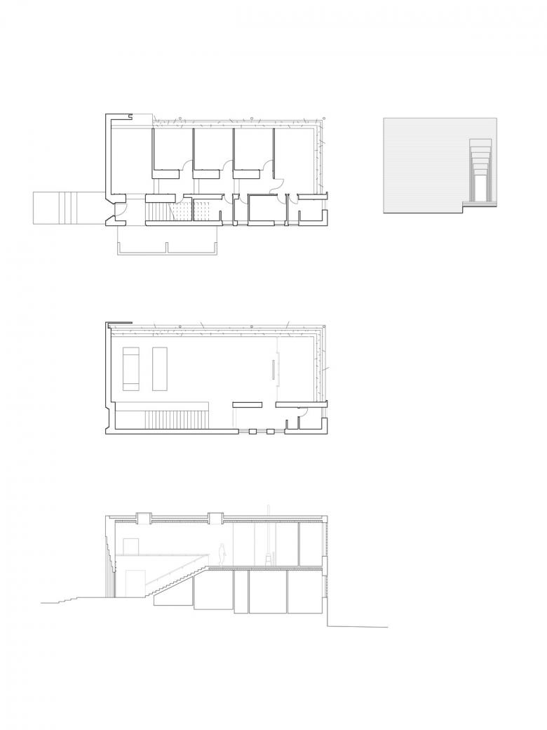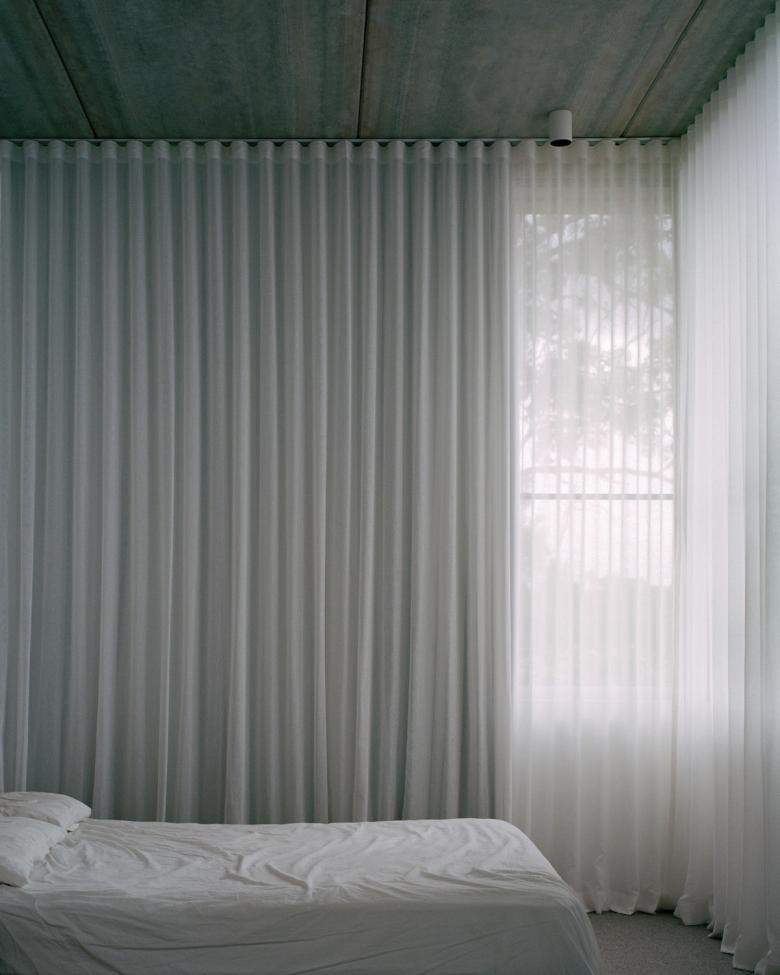 The actual layout of the house is simple, but reverses the standard floor plate arrangement: common spaces are placed above and bedrooms below, so together with the siting and very tall ceilings gives the occupants a feeling of living high up amongst the tree canopy. This is reinforced by avoiding floor-to-ceiling glazing and instead terminating the tall windows at one meter above floor height. The effect is great openness but also privacy from the street below, and a “nest-like” experience for the occupant. The lower floor slab steps down with the topography, telling you about the landform, and allowing each bedroom to have it’s own floor and “address.”
