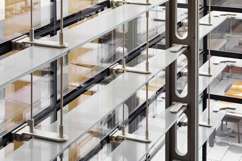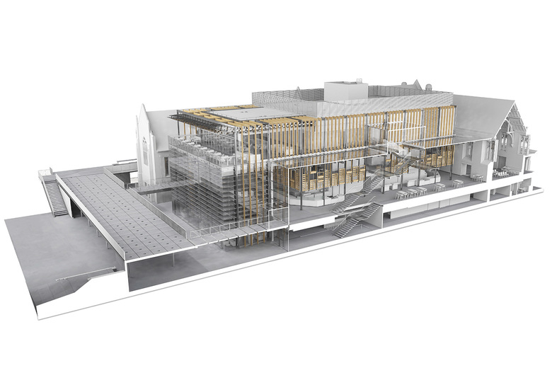 Transparency, connectivity and craftsmanship are central characteristics of the building’s design, introducing new spatial compositions meant to foster a greater sense of community. Dynamic and overlapping volumes weave together a myriad of activities that enhance the student experience while linking the historic legacy of the West Campus Union to its newfound energy. Circulation patterns that trace the campus master plan travel to and through the reconnected West Campus Union. Large portals framed into the existing stone walls, lined in blackened steel, open up views across the building. Steel and glass balconies perched in the gothic wood trusses allow fresh vantage points into the legacy of the past. A series of glass bridges enable shortcuts that link previously isolated spaces. This new network of connections creates a buzz of movement and interaction around the building, cultivating a palpable energy that defines the revived student community.