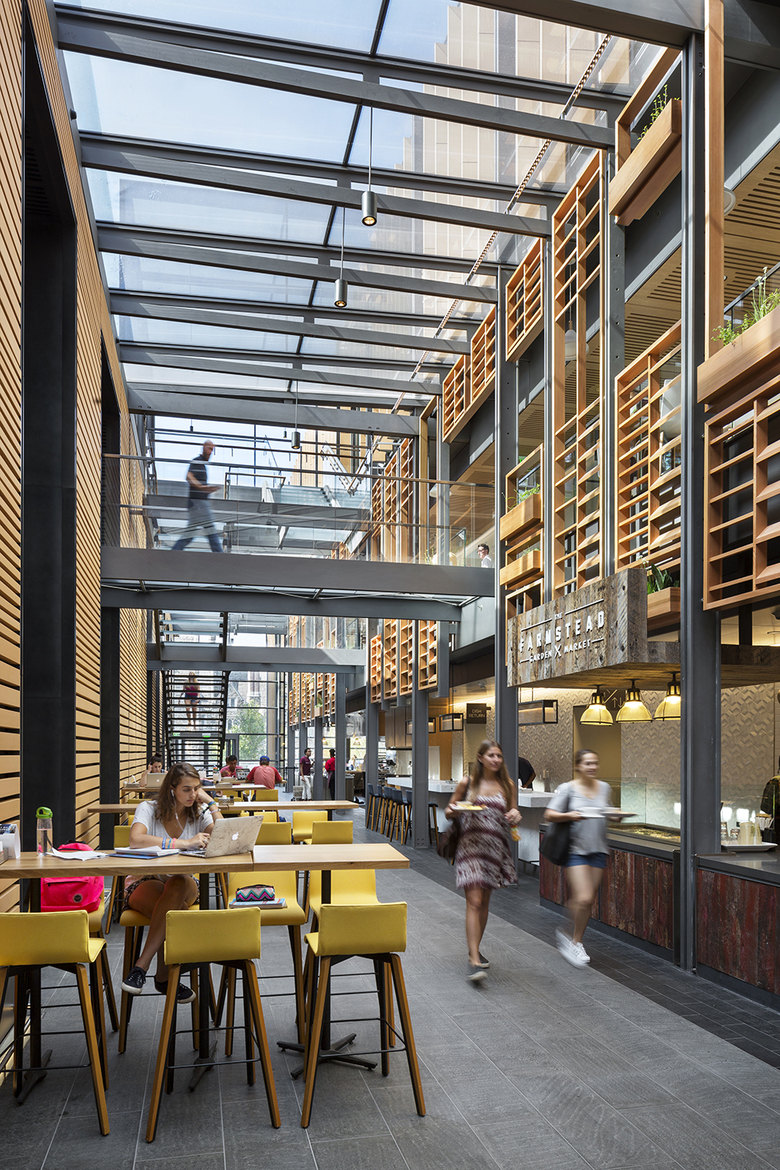 The new West Campus Union also brings forward culinary food exploration and education, housing 12 dining venues showcasing international and local cuisines, in collaboration with local vendors and food concepts. The new dining core provides made-to-order cooking featuring fresh ingredients and healthy, farm-to-fork organic options intended to encourage healthy lifestyle choices. No soda is served in the building, rather a range of hand-made flavored waters are made available free of charge.