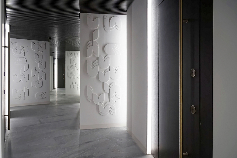 The communal areas within the buildings have rich use of materials and refined details. The sawtooth structure also prevails here. By emphasizing the vertical lines, a pleasant atmosphere is created; light fixtures on ceilings in the corridors have been replaced by vertical lines that light the walls. In the entrance halls and corridors the application of Amsterdam School related materials such as bronze, dark brown wood, natural stone can be seen in combination with modern-day elements like abstract, three dimensional tulip patterns and light ceilings.