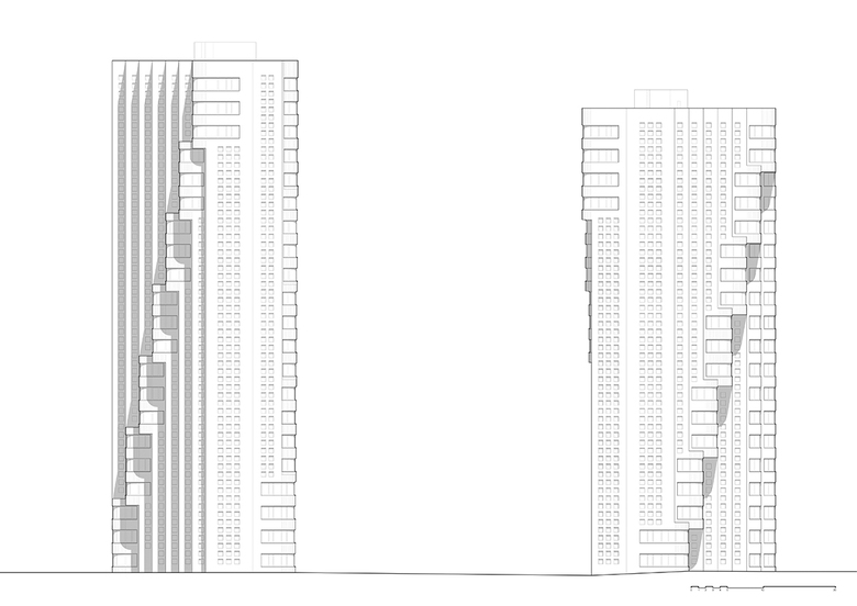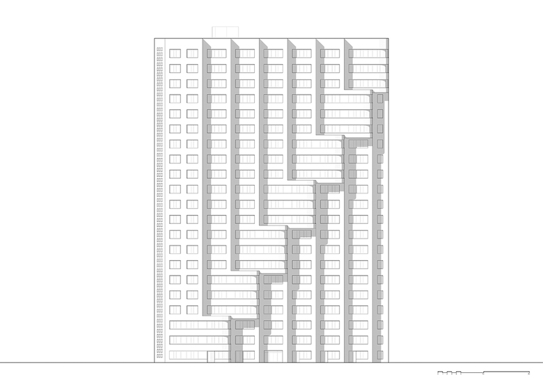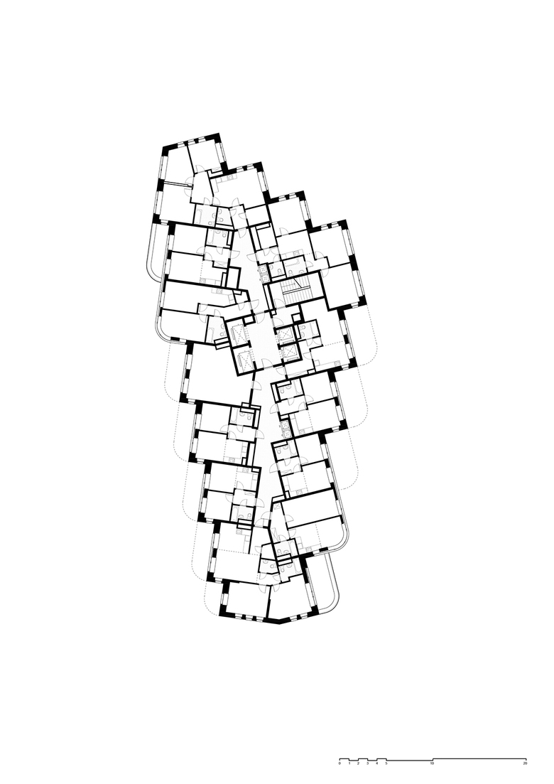 The conditions of the project Dutch House are exceptional. The rectangular building plot is enclosed on all four sides by residential slabs that are mostly higher than the two new blocks. Because of this the site acts as a large confined room with only a few openings through which views are possible. What was therefore needed was a strong concept to make living in the new apartments a pleasant experience.