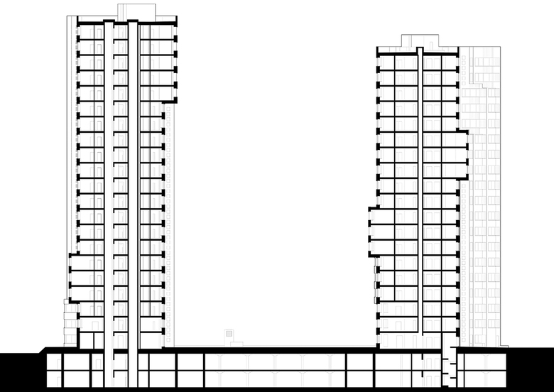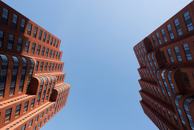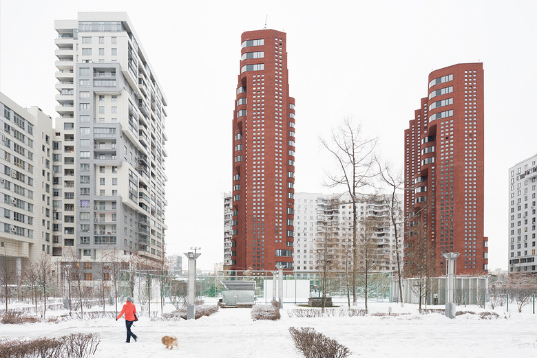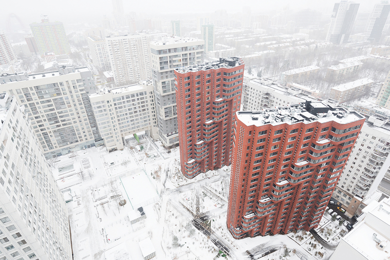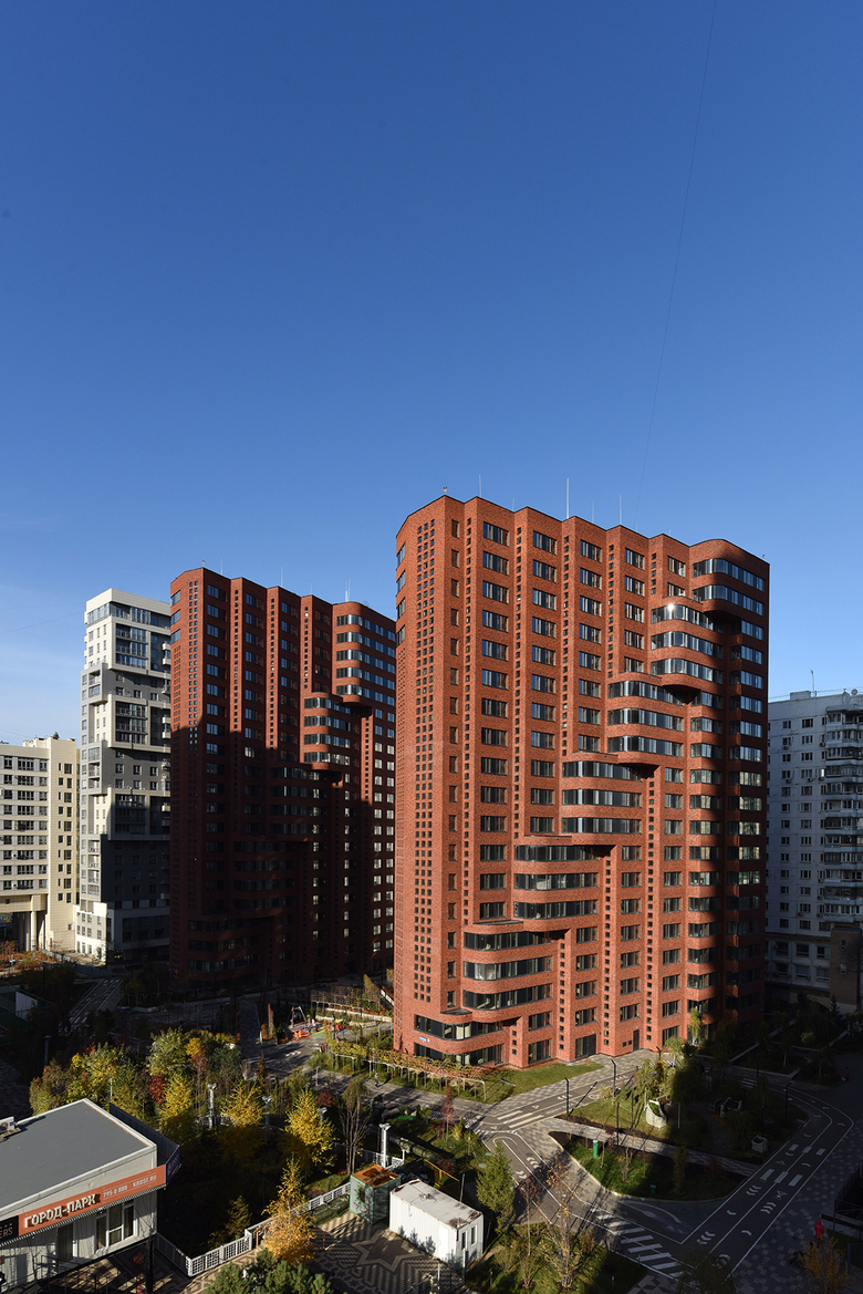 Dutch House is part of the redevelopment of District 75, situated in the western part of Moscow. Renamed Wellton Park, the district has been transformed by Russian construction-industrial company KROST, over a period of 20 years, into a luxury residential area with a very high density and a carefully landscaped ground level. Amidst the white and light grey apartment buildings, Dutch House catches the eye with its outstanding red brick color. The two buildings with a height of 75 and 65 meters contain 360 apartments on top of two layers of underground parking.