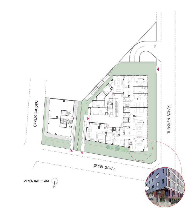 The blocks consist of 32 residential units with various sizes and commercial units facing the ÇamlıkStreet, in addition many common usage facilities are provided within the building. Making use of the level differences a courtyard and surrounding gardens are created.
