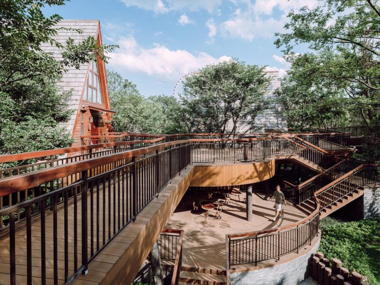 The history of the hotel can be traced back to ancient civilization. It is a kind of shelter with a wide view and practicality, while avoiding danger. We applied the concept into the project, enabling visitors to have a closer relationship with nature. The building is raised to a height of five meters. The elevated building is light and interesting and can have the widest view. At the same time, the height of the treehouse is aligned with the tree canopy. Looking out of the window, there are lush trees, giving people the experience of shuttling through the jungle.