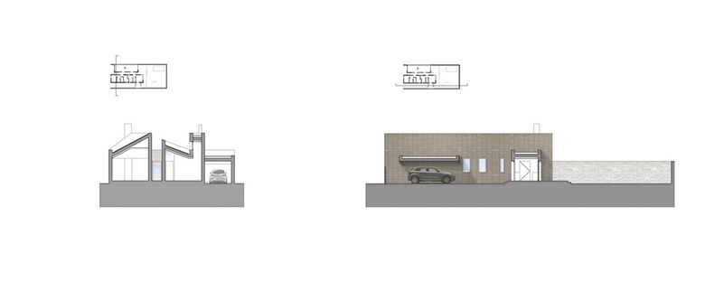 This structural walls come from the extrusion of two sections, generating two long parallel pieces starting from the street façade and getting into the yard. They don´t touch each other but they are connected by some flat roofs, covering the utility spaces like the hall, the laundry or the parking.