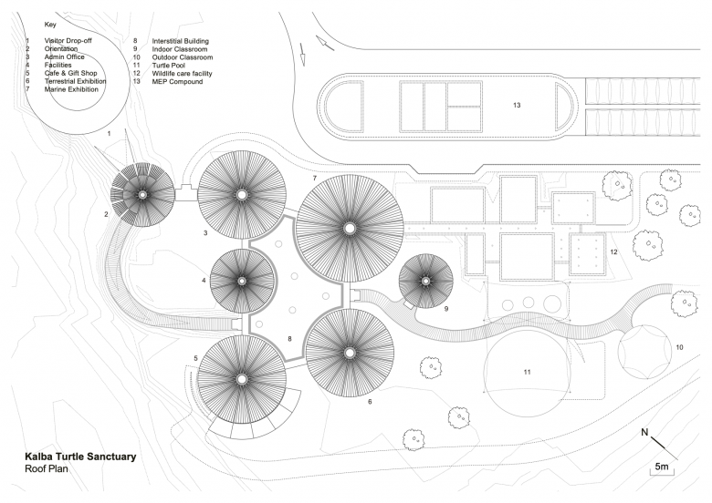 The geometry of the pods is inspired by urchin exoskeletons and purposefully echoes those of the Buhais Geology Museum, with which the Sanctuary is paired. The pods have been designed as prefabricated concrete structures to minimize disruption to the existing terrain, with concrete foundations which are simple robust discs, elevated to protect them on this tidal location.