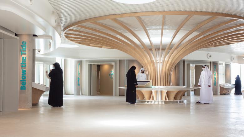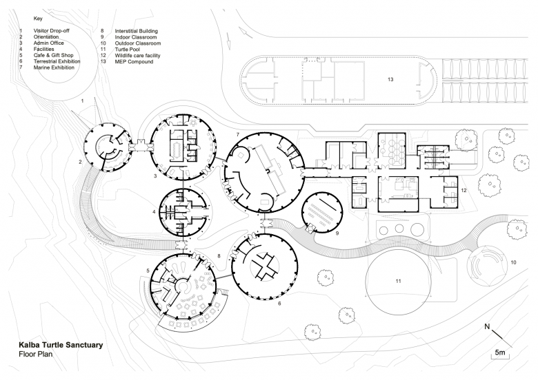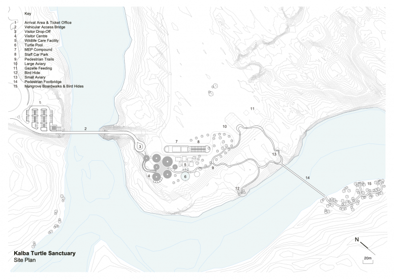 Seven interconnected pods and tensile structures create a visitor center, with a terrace and panoramic views towards the mangrove forests and distant mountains. Facilities include aquaria, exhibition areas, visitor amenities, staff offices, veterinary facilities, classrooms, gift shop, and a cafe. A carefully set out nature trail encourages visitors to explore the reserve’s rich biodiversity of indigenous mangrove forests and mud flats and the species it supports including turtles, stingrays, gazelles and the rare Arabian Collard Kingfisher.