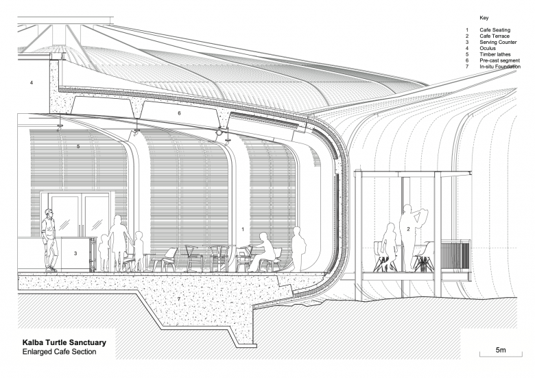 Visitors approach a dramatic, semi-enclosed ribbed pod which serves as an orientation space and features glazed openings orientated towards key views. A palette of light coastal tones softens the interior which is illuminated by skylight ocuili.