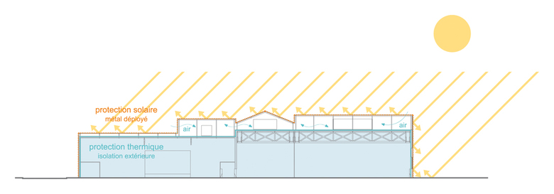 They all fit in a unique writing because they are all covered with the same principles of forms, materials and openings. The roof of each volume is then systematically made of two slopes, inspired by the design of the roofs you can observe in the surroundings, alternating the orientation of the folded faces sometimes North-South, sometimes South-West, in order to capture a light each time different. The expanded metal, used as a cladding on all the facades, also contributes to this unity, and gives the project its originality.