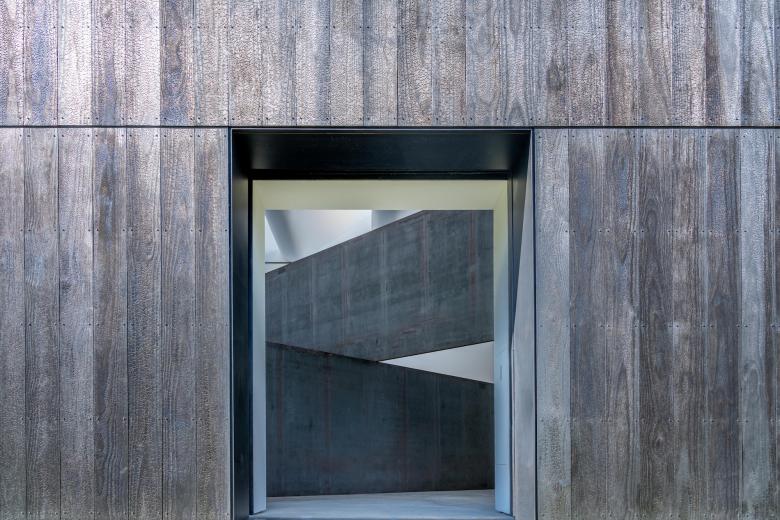Due to the mass and finish of the weathering-steel plates, the design mandated a carefully choreographed sequential dance between professional riggers and contractors to install the plates and the interior partitions during temperate weather to address temperature and RH control prior to commissioning the remotely located MEP system connected underground. Once complete, the pavilion interior spatially, figuratively and contractually became Serra’s “art piece.” On the exterior, a charred Accoya timber rainscreen wraps the façade shrouding the north-facing skylights distributing soft indirect lighting into the gallery. In contrast to the preserved dark mill-scale of the steel plates, the façade was designed to naturally patina over time.