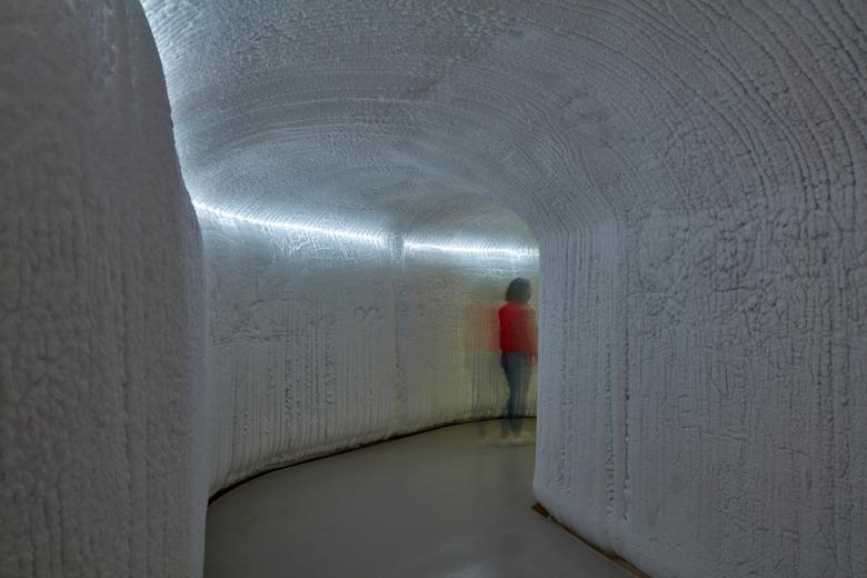 The entry tunnel features a very subtle floor incline, intended to slow the pace of movement through a compressed white passage, and to void the mind for fresh sensory input. Once visitors reach the central core, smaller slits in the living skin, called eco-transits, lead them towards the ecosystem entrances. As automatic doors at the end of the eco-transit open into the ecosystem, it remains visually obstructed by a curtain of beads. By the time visitors pass through the beads, they have been exposed to the climate, smells, and sounds of the natural habitat before seeing anything. At the entrance of the Subpolar Regions, KANVA designed a new ice tunnel that acclimatizes visitors during the transition, while the sounds and smells of puffins and penguins ahead provide additional sensory stimulation.