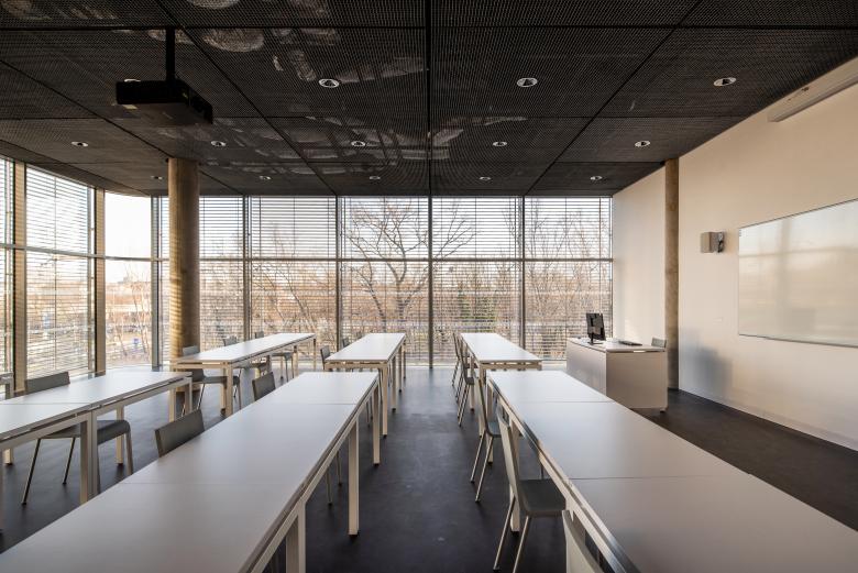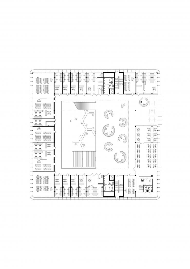 The conversion project preservers the external shape, height and proportions of the original canteen building. The main intervention is the creation of a generous central hall, illuminated from above, with daylight coming in between the trusses of the skylights. The hall is the heart and the social center of the faculty which spatially connects all three floors of the building. The entrance, located on the level of a raised plateau, enables a simple connection of all floors by two differently shaped one-flight staircases. Cantilevered galleries along the perimeter of the hall provide access to seminar rooms, teachers’ offices and two lifts with fire escape staircases. The lowest level of the hall accommodates large common lecture halls, auditorium, faculty’s library and the deanery.