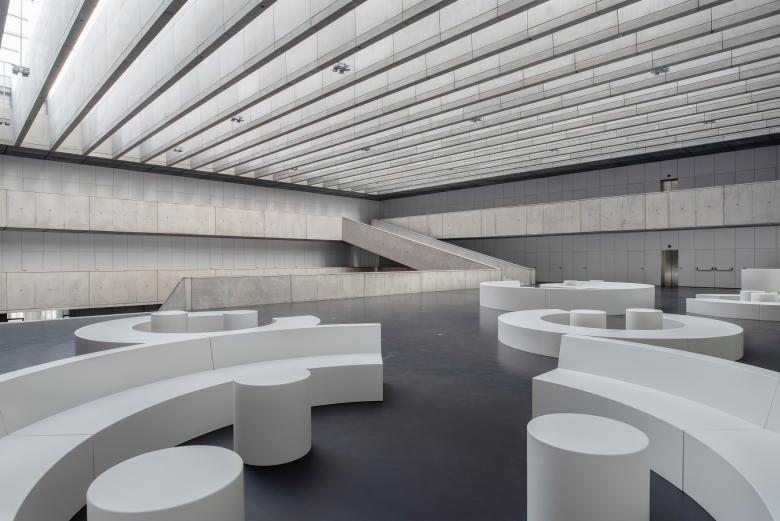 Prevailing materials in the interior are exposed concrete combined with a fine metal ceiling mesh, black floor screed and white wooden elements and furniture. The space is dominated by a variably set seating furniture in orange.
