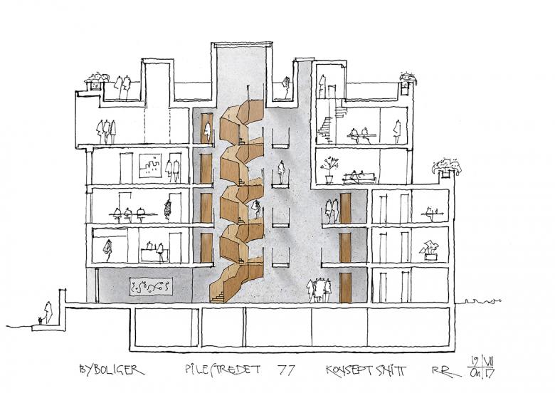 The project with 59 residential units has prosperous and well thought internal common areas which create a positive and worthy common framework for the residents. Cast-in-place concrete walls create a modern but timeless expression together with a warm oak wrapping up the staircase.