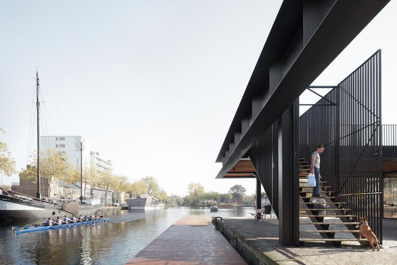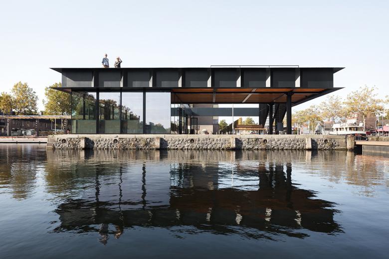 The design of the iconic pavilion is rooted in the historic harbour and its characteristic atmosphere: The inert black cargo ships and the robust bridges form a set of iconic attributes in the harbour park. The straightforward shape, the robust structure, the matte black façades and the combination of steel and wood are magnifications of the site and its surroundings. The shape and details of the structural platform were a result of an integrated design process, where several needs were combined in one architectural element: from floor separations to sun protection. The pavilion thus becomes a simple and self-evident iconic part of the public space in the Piushaven Harbour.